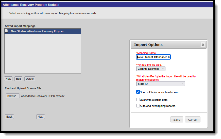 When you created the Import mapping, you chose how to map the data to the selected students. Now you are going to use that entry to test and eventually import the data in the source file to create Attendance Recovery Program records.
