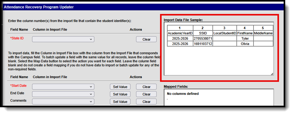 - Enter the column header name from the import file that contains the student identifier. For the field name State ID, select SSID from the Column in Import File field. That field is then displayed in the Mapped Fields window.